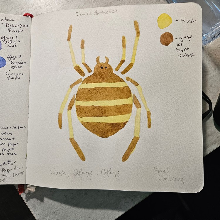 I was initially sceptical. The projects seemed more illustrative than painterly — more like children’s book art than fine art. But having now completed the course, I happily admit I was wrong. Each exercise is perfectly aligned with the learning goals, and they build progressively in difficulty (which I appreciated — I get bored when things are too easy). By the time I reached the final project — a spider painting you can see below — I felt confident I could complete it without needing step-by-step guidance.
